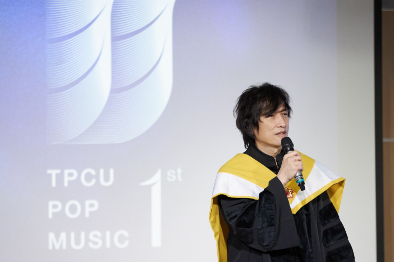 並說:「用你的音樂、微笑改變世界,而不被這個世界改變你!」他並勉勵同學要學會做人,並說:「20年前與薛老師共事,打造出巨星陳奕迅、陳潔儀、葉璦菱,主任的鐵血都在裡面。他成立此系,在流行樂壇裡面,赫赫有名的作詞作曲製作人都幫你們來上課。為什麼?因為他人緣好、做人成功。」並指出系主任不斷努力,每回都告訴他增加了什麼設備、接下來想完成什麼。「當學生踏出校門不是失業而是與業界接軌。」並讚校長有魄力,花這麼多錢。準備這麼好的教材、器材和師資,重量級的大老坐在台下,「他們有豐富的資源,做你們的後盾,真的為你們開心,這也是我參加的第一個流行音樂系畢業典禮。」