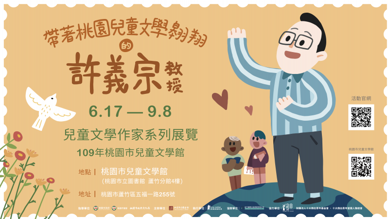 長期致力推動在地兒童文學的桃園市兒童文學館,自107年開始,每年為大家介紹三位熱忱耕耘兒童文學的桃園兒童文學作家。而今年度的桃園兒童文學作家系列展覽第二檔活動「帶著桃園兒童文學翱翔的許義宗教授」,將於6月20日(六)在桃園市兒童文學館舉行開幕,展期為6月17日(三)到9月8日(二),開幕當天將有數十位藝文界人士與教育工作者共同參與,為展覽致上祝賀。