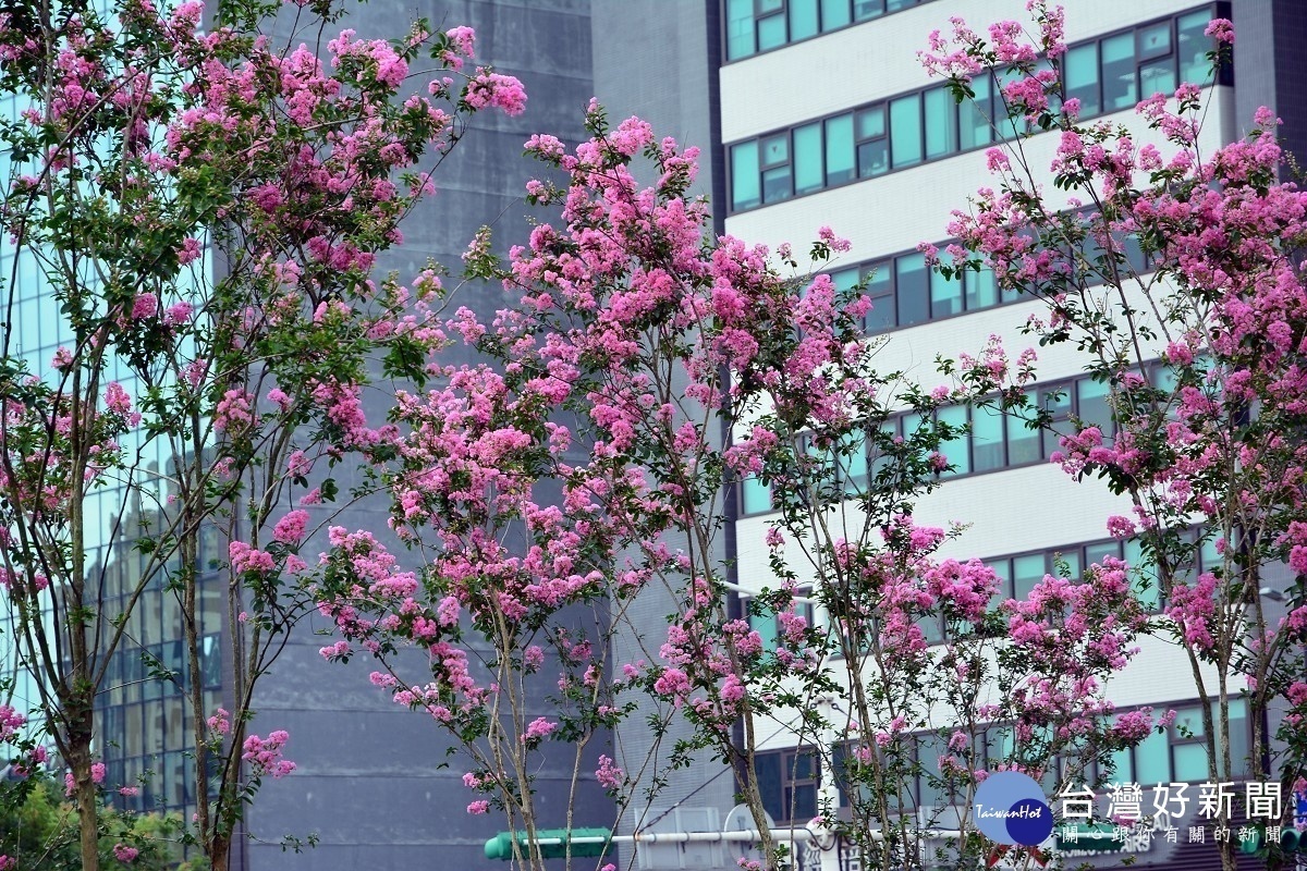 北市工務局公園處處長陳榮興表示,大安森林公園去年於信義路側沿線及露天音樂台旁,藉著種植紫薇小型喬木搭配整型精緻的灌木,打造出有別於一般公園形式的精緻花園,目前正值紫薇開花時期,花季將一路延續到7月。