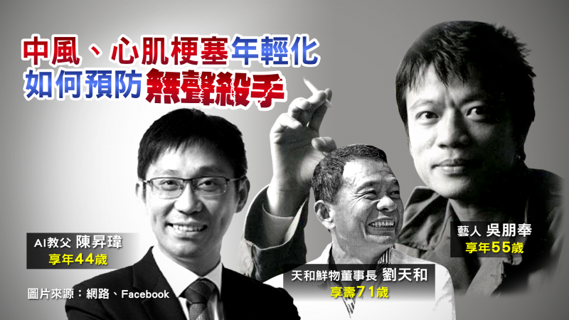 在3月時吳朋奉曾向友人透露,自己常常喘不過氣,有胸悶、心悸的狀況,不料5月底就發生憾事。雙和醫院神經內科醫師鄔定宇表示,台灣其實每10分鐘就有一個人中風,大概47分鐘就有一個人因為中風而死亡,發生率其實非常高!目前將年輕型中風定義為45歲以下發病的患者,過去這10幾年來,引起中風主要的危險因子,高血壓及糖尿病,在年輕族群中的佔比,從5%提高到10%,因此,年輕型中風病患的個案數也幾乎雙倍成長!年輕中風患者,以出血性中風居多,佔了五到六成,其中有很多與血管性疾病有關,例如:動靜脈畸形、血管瘤,甚至是主動脈剝離,導致血管破裂出血而形成中風。而老年人的中風,以缺血性居多,大部分是因血栓、腫瘤引起血管堵塞造成腦梗塞。