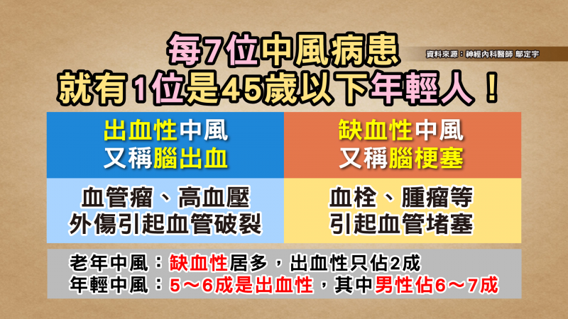 年輕人出血性中風佔5~6成 老年人則以缺血性居多