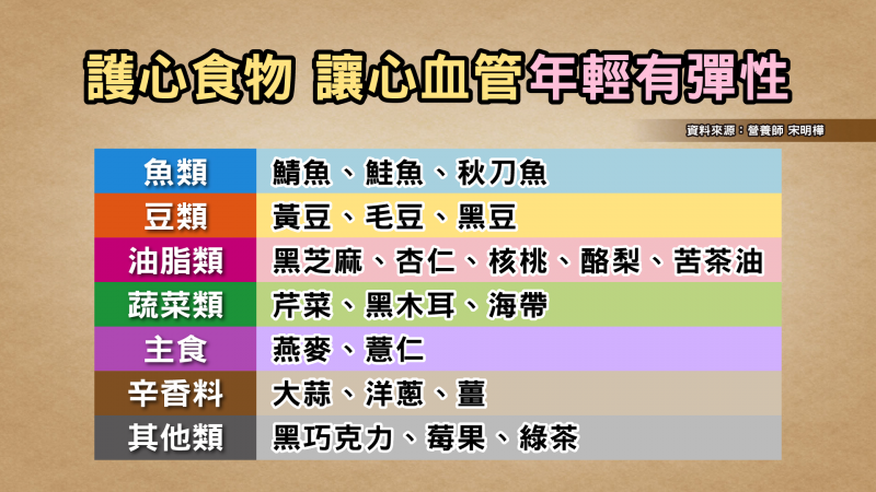 想從根本預防中風,就要透過食療,讓心血管回春有彈性!營養師宋明樺表示,除了飲食要清淡少鹽,控制熱量及多運動,控制血壓、血糖和血脂肪等危險因子外,還需要多補充護心食物,像是鯖魚、黃豆、酪梨、芹菜、黑木耳、薏仁、大蒜或綠茶等。這些好心食物通常含有大量的纖維素、抗氧化物,而一些脆、軟、滑、粘的食物,都含有水溶性膳食纖維,可達到降膽固醇及防止血液凝結的效果,預防心血管疾病。 要了解更多「心血管保養」的相關內容,請鎖定TVBS 56頻道每週一到週五下午2點,六、日晚間7點《健康2.0》,節目中將有詳盡的示範和解說。