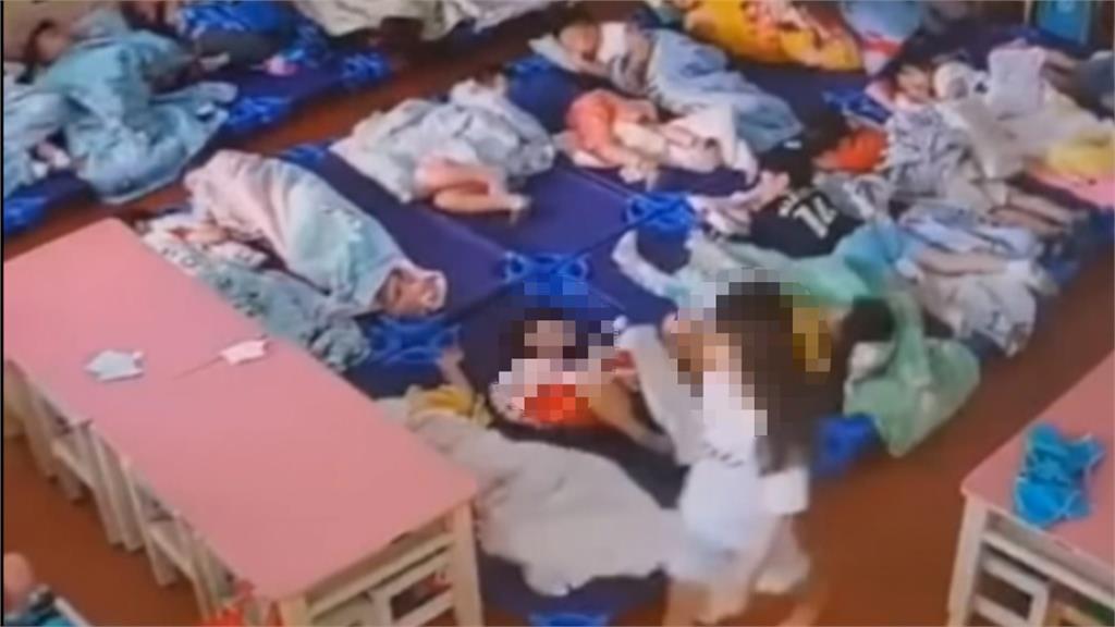 午休時間,幼兒園裡小朋友躺在教室內睡覺,就讀大班的女童上完廁所慢慢走回自己的位置,沒想到一旁穿著黑色上衣的老師直接拉扯她的頭髮,力道之大導致她跌倒,接下來更過分,老師還把她的棉被丟出教室外,命令女童自己撿回來。