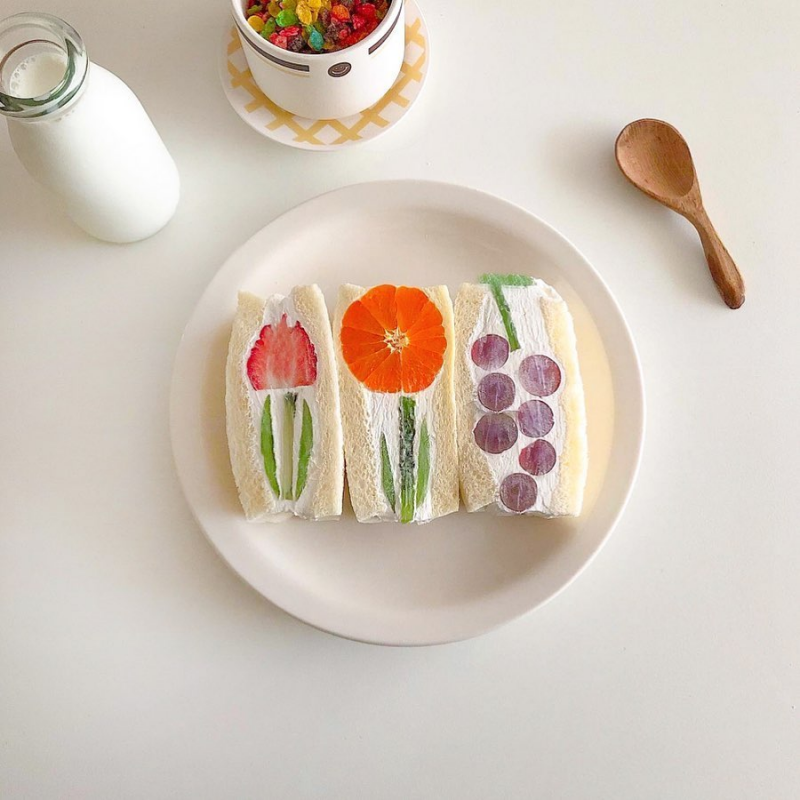 為什麼「水果花三明治」會那麼紅呢?看看那切面可愛的花朵圖案,兩片白土司中間夾上厚厚抹醬,包裹著