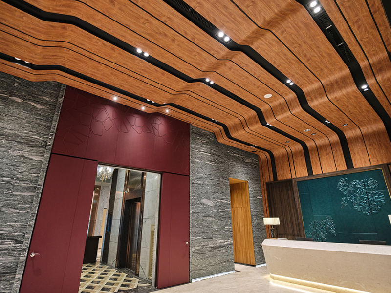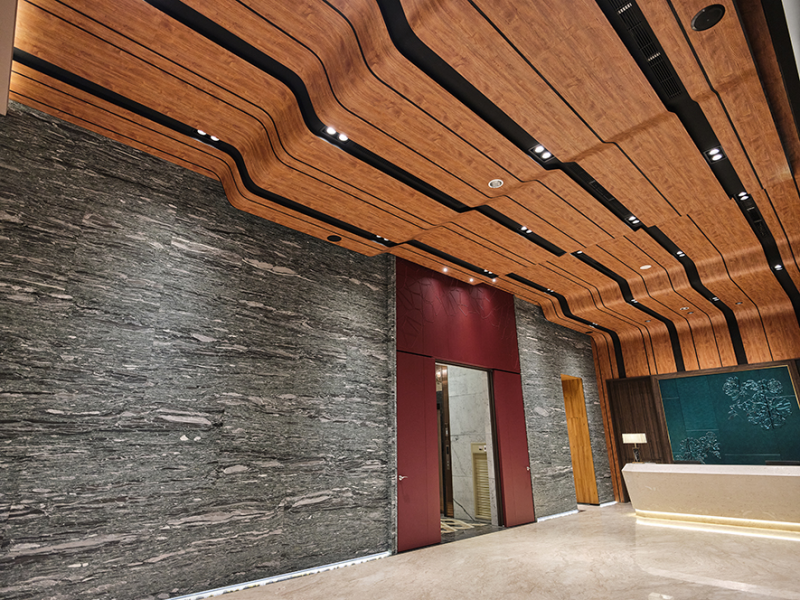 While entering the hall, the eye-catching colors of deep wine and pearlescent aqua grabs the sight, which manifests the stunning texture. The wall at the back of the reception counter and the