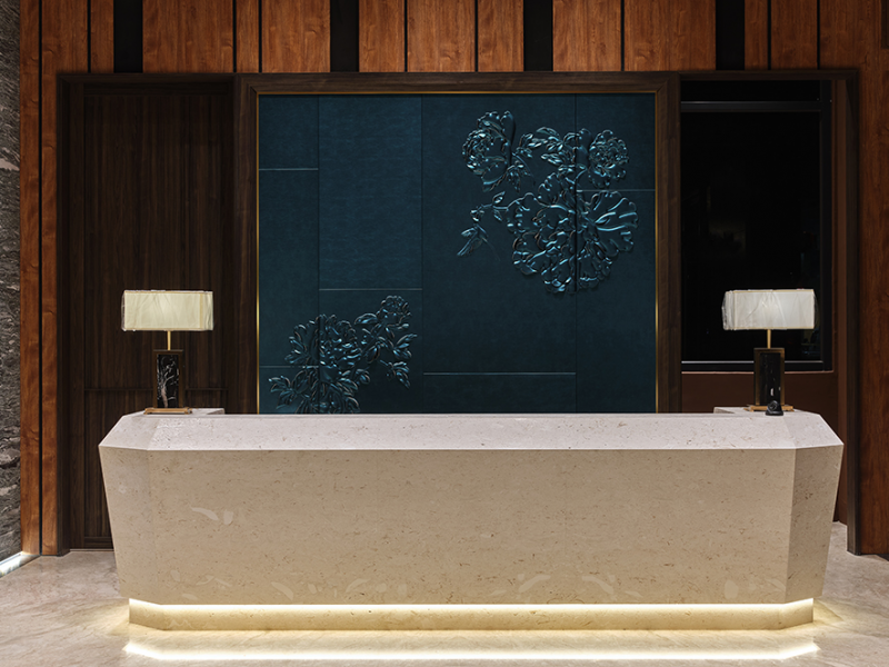 進入大廳,搶眼的酒紅與珠光藍迎面而來,予人強烈的視覺感受,進口材質的紅、藍皮雕版,分別在櫃檯後方以及廊道防火門做出造型。此外,團隊更在製作櫃檯背板時,以泡棉的佔比製造面板的厚薄差異,展現拼貼面的趣味;在此之上,更細心呈現散發貴氣的牡丹模樣,增添場域格調。