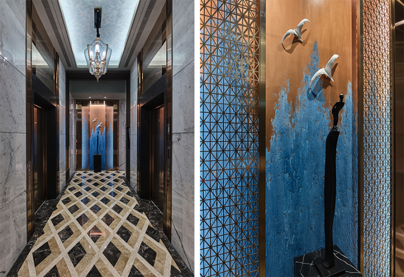 和外部接待大廳做出區別的電梯廊道,在形塑視覺3D效果的地板導引至終點後,是展演遼闊意象的鈦金屬端景,藉由窗櫺景致聯想的造景,伴以擺設品身後採特殊塗裝作法的藍與金,將筆直通道的空間感延伸向前。