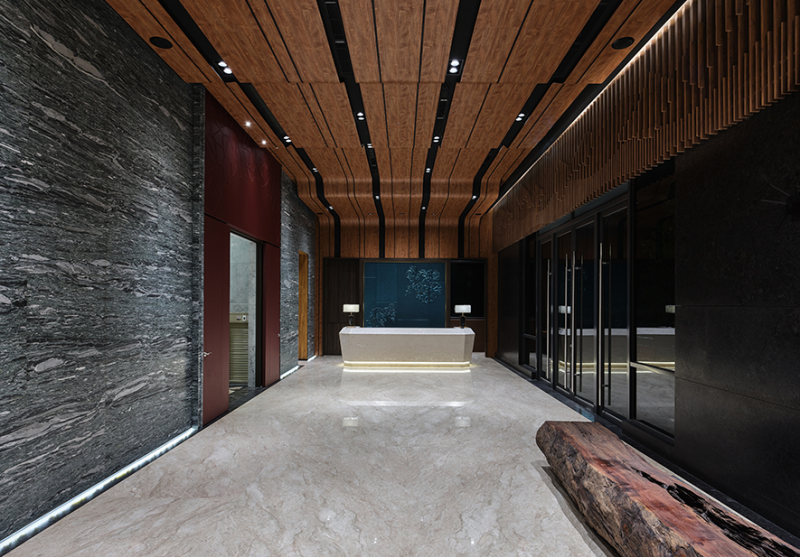 There is no specific style of the configuration. The design team exploits abundant timber and stone to layout the space. Both the ceiling and the wall at the entrance are constructed of nature