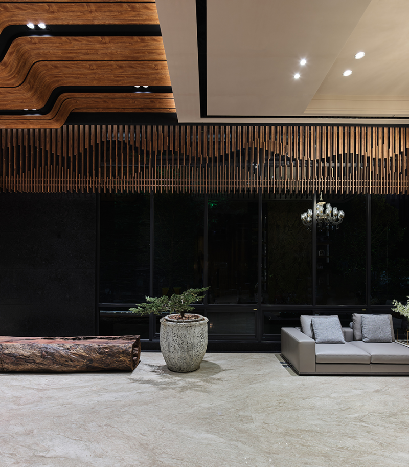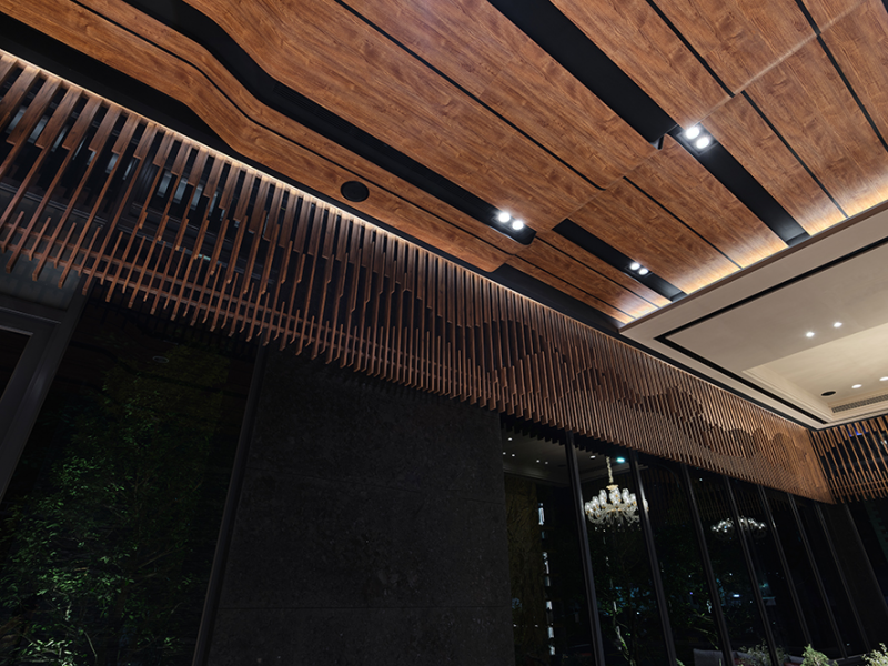 Considering that the setting of the sunblinds will conceal the outdoor scenery, thus the design team decides to make up the wooden gratings along the ceiling sides, which brings out the landscape