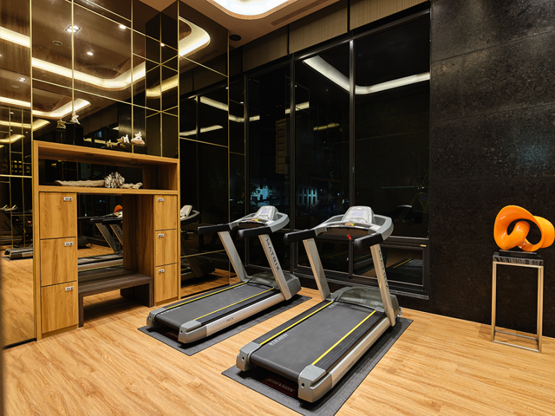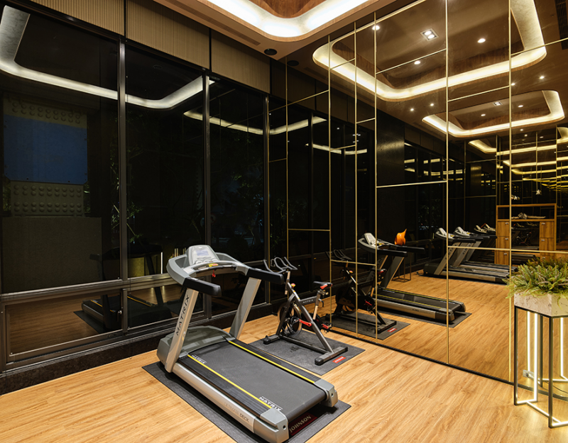 The fitness centre exploits tawny glass mirrors that go with the irregular metal lines, which enriches the spatial situation. Besides create the roomy perception, thus reflects the posture of the