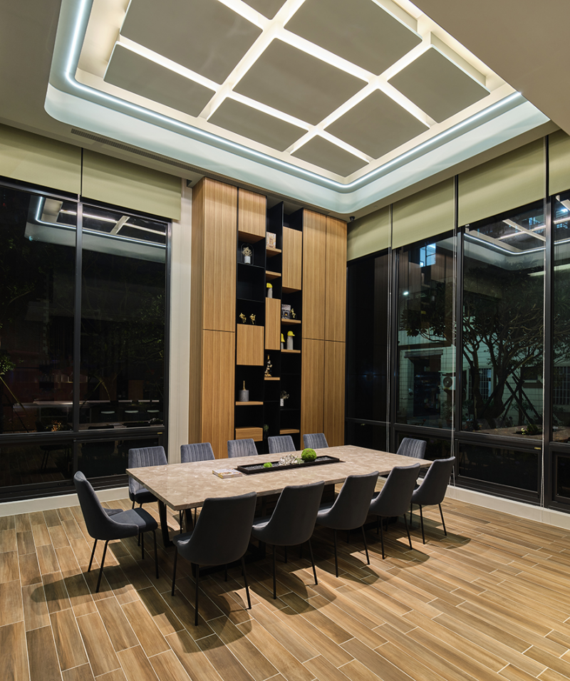 獨樹一格的區塊照明臉譜,在此揭開序幕,團隊成功克服弧形面框的做工難度,將木質地搭配暖色系漆面,在玻璃左右環伺的區域中,渲染溫柔的自然因子。