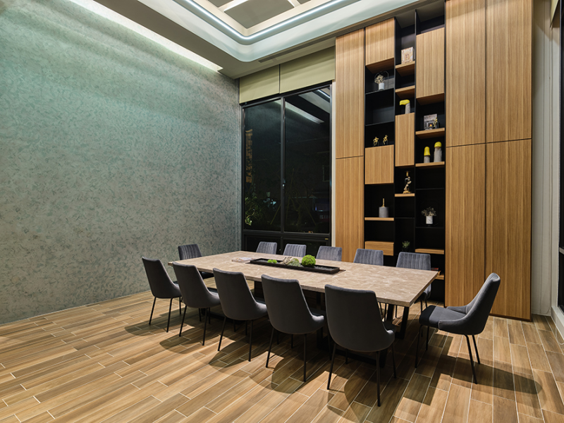 The wall surface of the cookery classroom makes use of the Italian paint the same as the fitness center. The pearlescent paint changes with the light and shadow and the viewing angles, and the