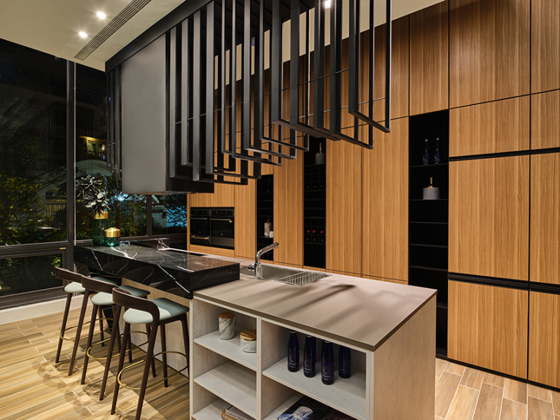 將工作區和中島相結合的餐廚區,佔面最大的黑色塊處包藏了抽油煙機和其管路,配上左右具高低與寬細差別的鐵件,顯出動感波浪造型。看往吧檯中島處,不僅有用做區隔的石材,更有使用義大利進口奈米智慧材FENIX的素色檯面,面對廚房工作造成的輕微刮損有修復效果,便於長久使用。