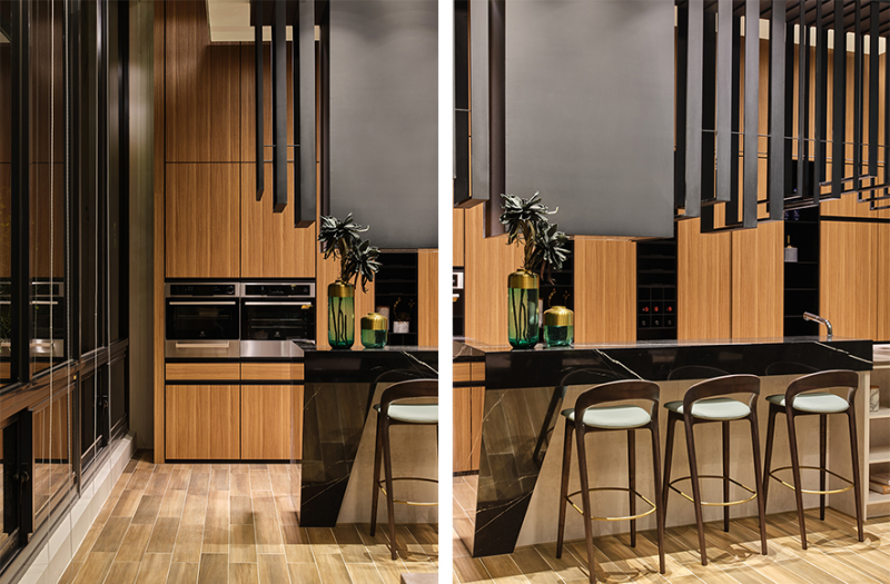 creates the dynamic feature of waves. The kitchen island is divided into two parts with a stone board and the imported FENIX countertop from Italy. The intelligent material is convenient to