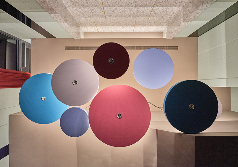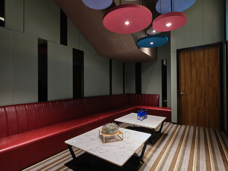 Due to the small plot of the audio-visual room, which is partly underneath the staircases. The design team hopes to meet the specific requirements of the lighting atmosphere, audio equipment, and
