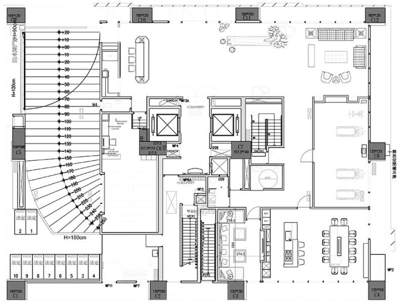 依循其想法加以劃設,使整體景觀具渾然天成的壯闊風光;引渡山水意象進駐公設,突破日常的天地壁構圖,採用波浪符號以及相異的材質與色樣,最終鋪敘出色彩濃豔卻寬闊非凡、具流動性的量體景觀。