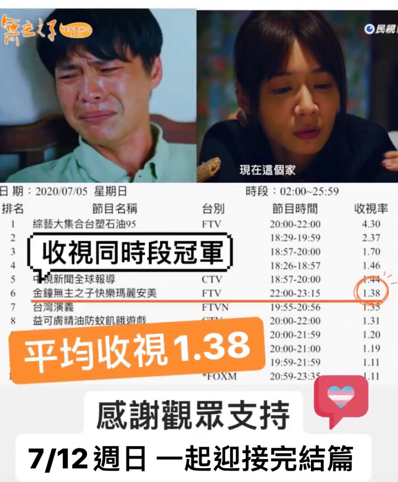 民視金鐘好戲《無主之子》昨晚(5日)在民視播出第二集,引起廣大迴響,收視率出爐開紅盤,平均收視1.38,最高收視高達2.9,為同時段冠軍,坐穩週日十點檔冠軍寶座,正在拍戲的李又汝,聽到高收視率都非常開心。