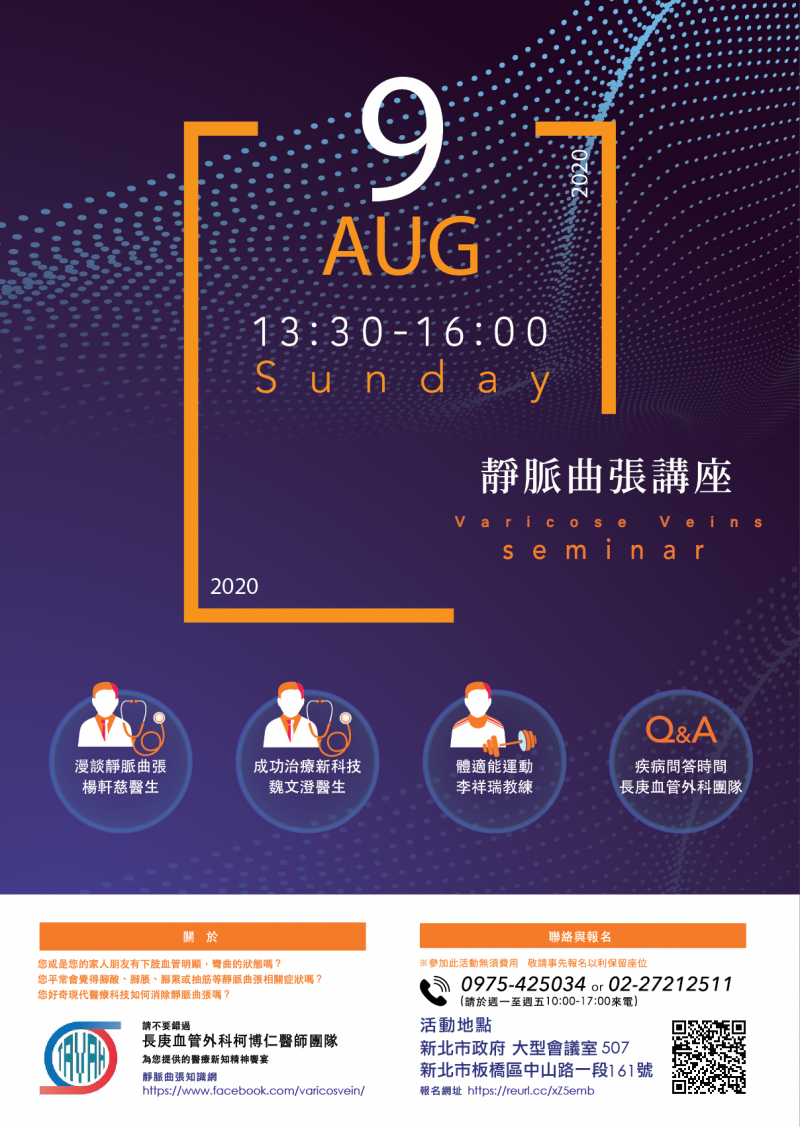 為了讓大家能夠更加了解靜脈曲張這個疾病,長庚血管外科靜脈團隊將多年治療臨床經驗,用深入淺出的方式讓各位能夠了解靜脈曲張的故事,由台灣血管通路健康協會主辦的「靜脈曲張講座」,將於109年8月9日(星期日)下午13:30在新北市政府五O七大型會議室(新北市板橋區中山路一段161號),由長庚醫院血管外科靜脈曲張微創治療團隊主講,邀請柯博仁醫師、楊軒慈醫師漫談靜脈曲張、魏文澄醫師談成功治療的關鍵科技、李祥瑞教練談體適能運動等。
