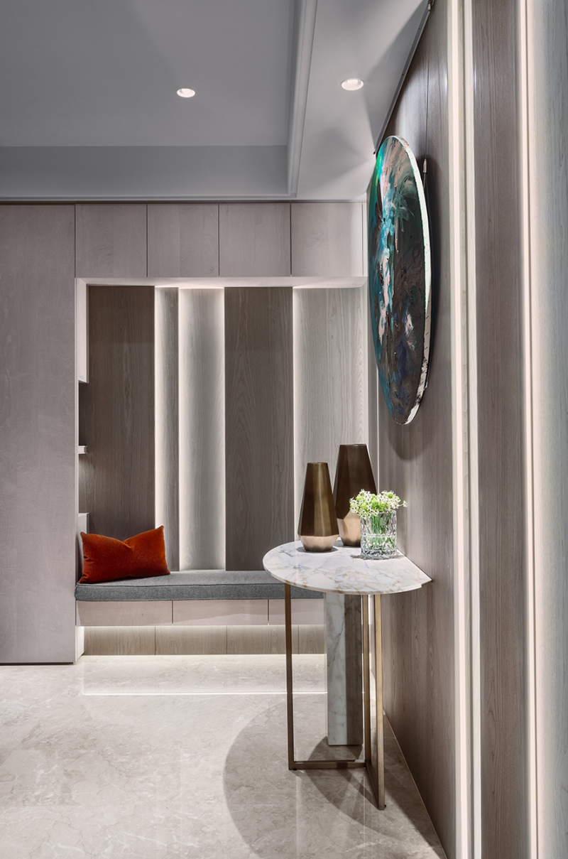 由於屋主一家四口皆熱愛親近自然、體驗紮營野炊的生活,因此設計師將原來玄關的二進雙開電動門,改為具收納機能衣帽間,並規劃所屬功能,使其空間運用更符合屋主需求,方便自理露營用品、鞋類、登山用具等。並採以具大地色系的深色木質料設計立面造型,配置間接光源,寓意曙光微露於山脈層疊的自然情懷。