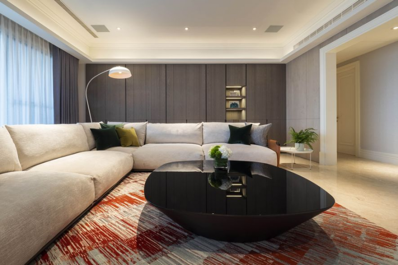 走過玄關進入客廳,地坪上鋪排出自名家設計的二款地毯。灰階帶綠寓意自然景況,使熱愛露營、登山的一家人,在室內亦能體會到山嵐環繞般的山林氣息;另一紅色彩度則表現了夕陽絢爛的光景,共構出宛如落日晚霞環伺臨山豪宅的磅礡氣勢;場域由冷色調轉為暖色調,同時象徵四季更迭的時序意境。