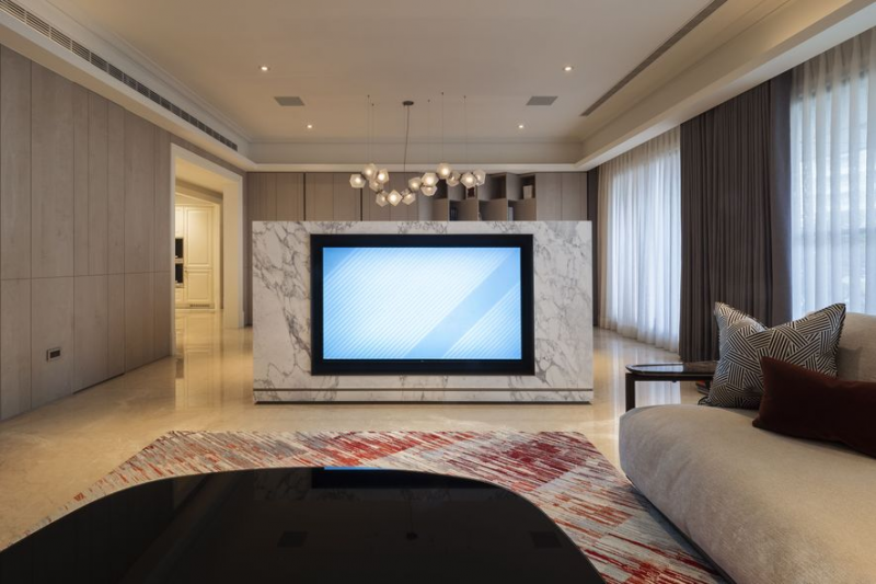 (圖)半高設計的雙機能電視牆,形塑視野穿透性,亦作為場域媒介串連客、餐廳,構成流暢俐落的回字動線。