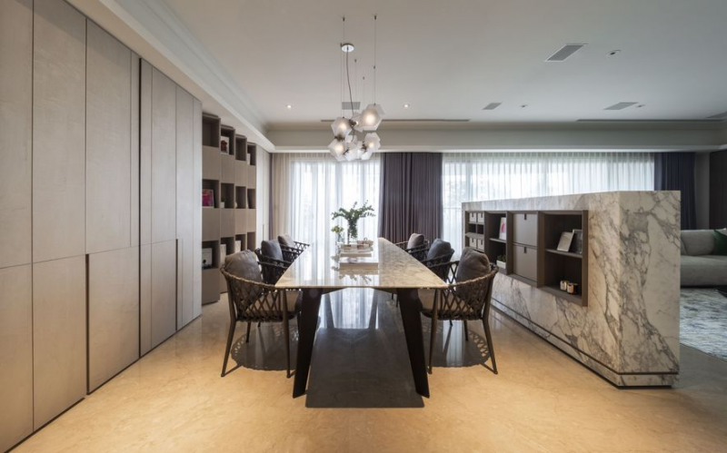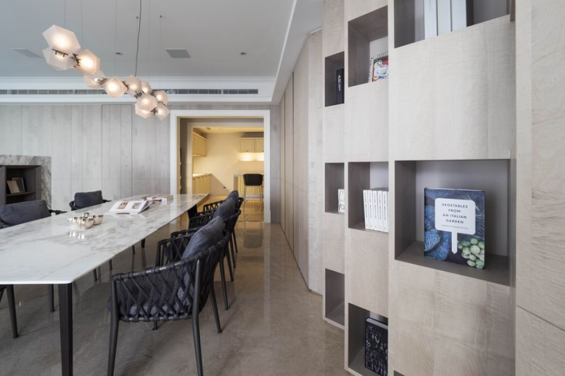 餐區後方以錯落斜拼的展示櫃為主體,搭配特別訂製的手工玻璃吊燈,及應用於戶外家具的餐椅,配合可調控光源,令人有林野間野餐般的趣味與隨性自在。客、餐廳間僅以電視牆為中央媒介,因此視野寬闊、空間寬敞,構成流暢動線,以供業主一家凝聚生活溫度的共享場域。