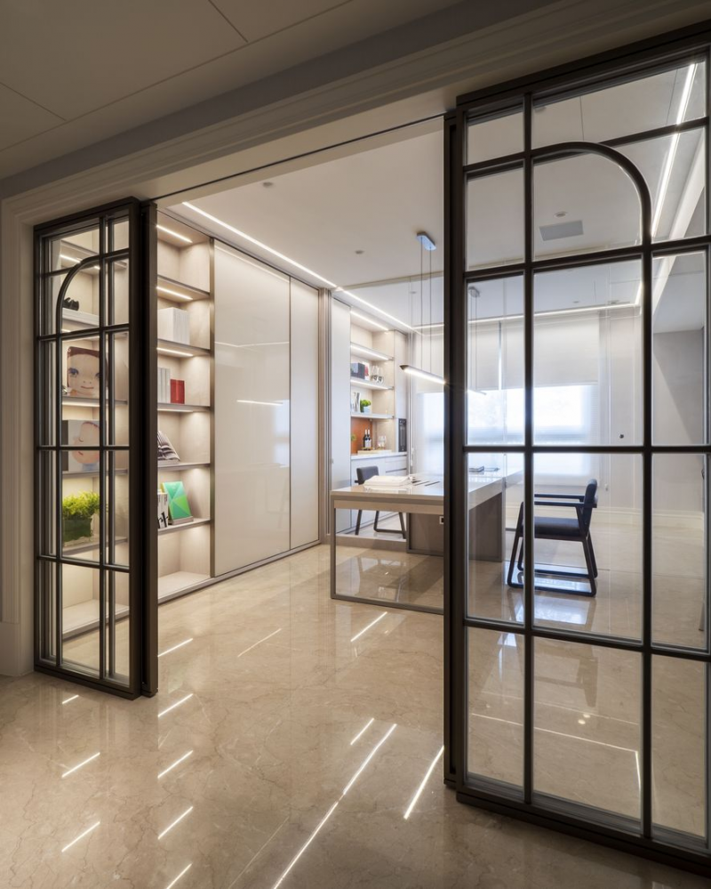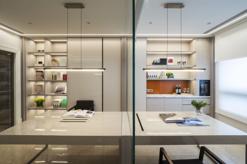 在家中,除了重視生活互動之外,閱讀氛圍也是不可或缺的環節。設計者以「陪孩子成長」為情感核心,延伸出「家即圖書館」的空間概念。利用隔音玻璃及客製書桌設計,擘劃共讀區,將視覺、機能延伸至男主人的工作區域,讓孩子在閱讀與學習的過程中,不離家人的陪伴與情感。