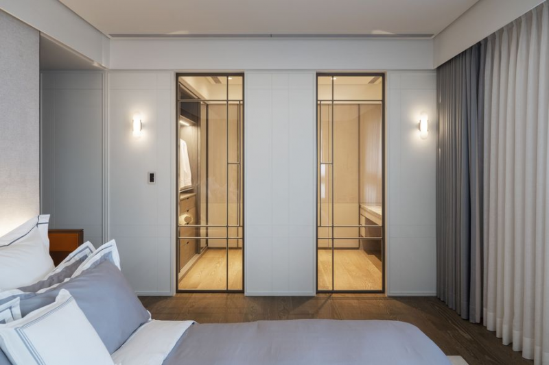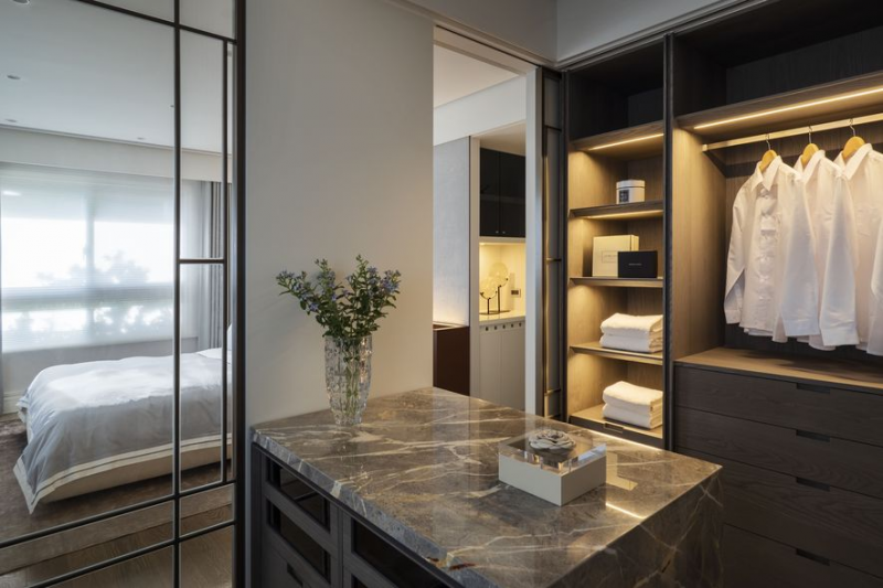 在臥室方面,設計師首先將主臥、男孩房與女孩房分區安排所屬位置,以互不干擾的前提規劃動線,建構獨立卻具互動的領域。主臥保留男主人的更衣間,並利用原有起居空間打造女主人更衣室,讓屋主一家能各自擁有私享。