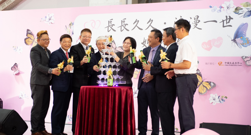 圖:浪漫一世婚禮展主辦單位李鎂司長(右四)、臺北市政府產業發展局王三中副局長(左四)及業者共同出席開幕儀式。