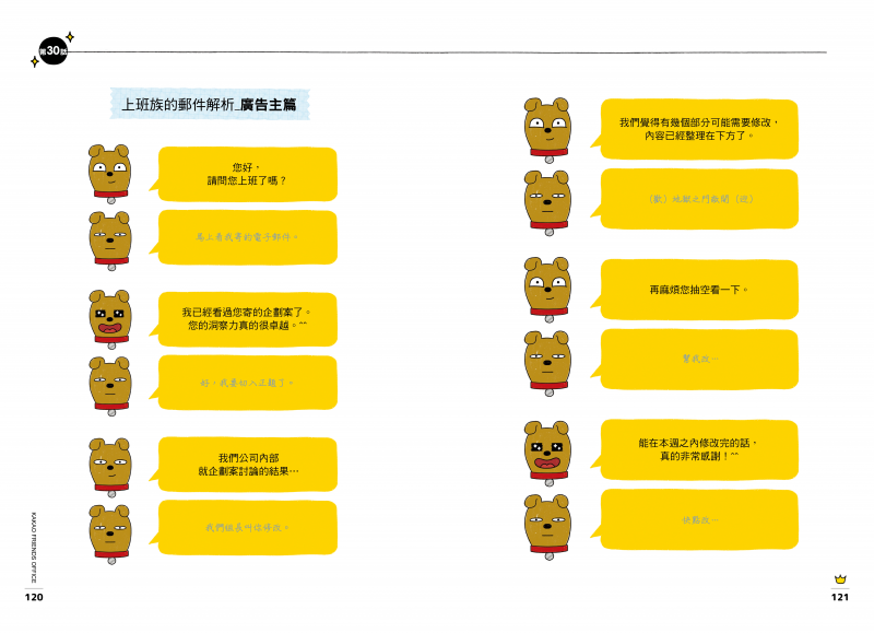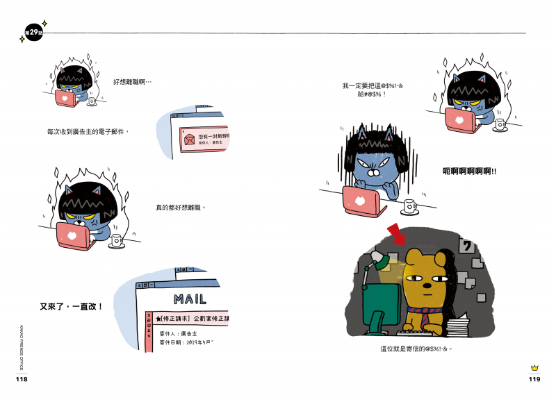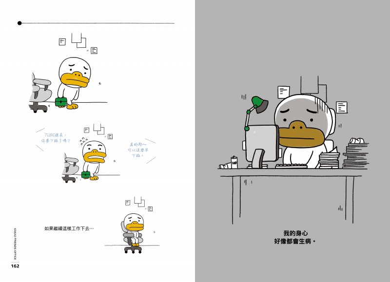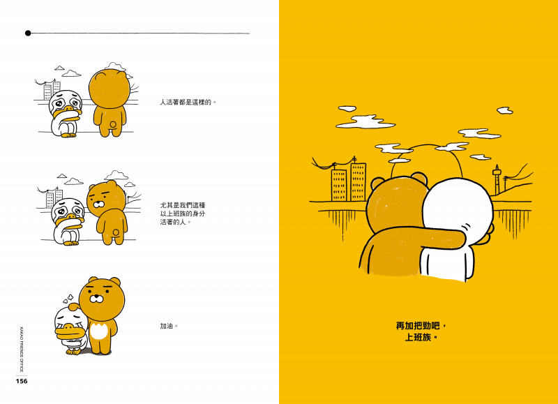 還有颯爽職場女子NEO與冷峻課長FROOD諜對諜,客戶和業務的溝通就是表情符號的虛假應酬!就算是可愛的KAKAO FRIENDS也會被討厭的主管針對!宛如就在自己辦公室發生的故事,8/5讓可愛的KAKAO FRIENDS陪你一起等待下班的時光,首刷附贈「萊恩幫你呼呼」造型便條紙。