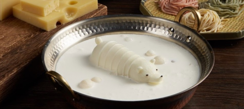 在高雄發跡的星野肉肉鍋,進軍台北開店後也受到許多饕客歡迎,其中起司牛奶鍋的最大特色,莫過於白色「小熊造型」湯塊,食用時將小熊丟入鍋中,看上去像是泡澡的模樣超可愛,上頭還有像是毛巾的起司片,伴隨熱氣在鍋中慢慢融化,讓不管是愛吃鍋的老饕,或是相機先食的網美們都眼睛一亮。