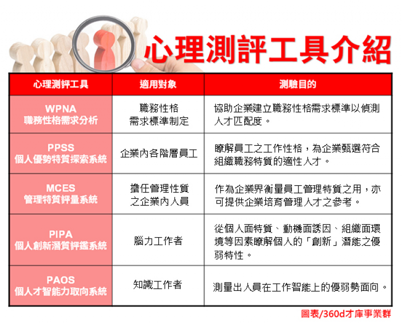 對此,360d才庫事業群董事長楊朝安建議,企業可混搭心理測評工具作為參考依據,其優點是透過科學化數據分析,可以客觀找出職務與人員匹配的特質,像是可深入瞭解求職者工作性格的「PPSS個人優勢特質探索系統」搭配可明確辨識職務性格的「WPNA職務性格需求分析」,兩者交叉比對,選才就能事半功倍;其它針對「腦力工作者」與「知識工作者」則可分別藉由「PIPA個人創新潛質評鑑系統」和「PAOS個人才智能力取向系統」做為選才評估。