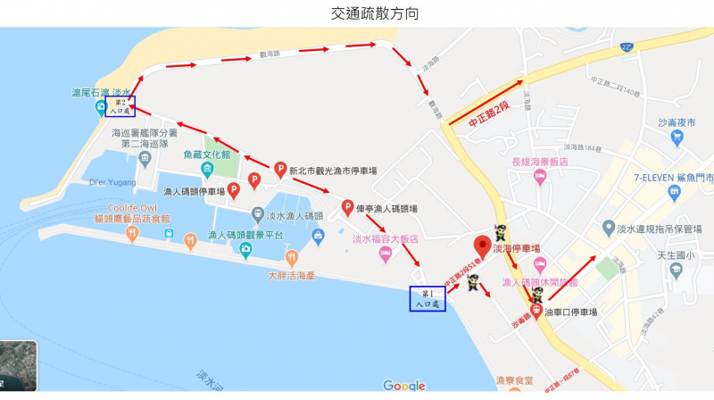 新北市農業局提醒,為避免塞車影響出遊興緻,所有至港區公車從下午4點開始僅停靠「淡水魚市站」,同時間亦陸續針對港區內外交通進行管制,請民眾配合交管人員指引,此外,活動結束為疏導人潮及維持車流量順暢,建議駕車民眾可多使用替代道路,開往淡金路再至台北或三芝方向:從漁人碼頭第1出入口離開之汽車可行駛沙崙路,再右轉濱海路或新市二路銜接淡金路;第2出入口離開之汽車可行駛中正路2段往新市鎮方向銜接淡金路,如此可避免往淡水市區車流過量造成回堵,影響旅遊興致。