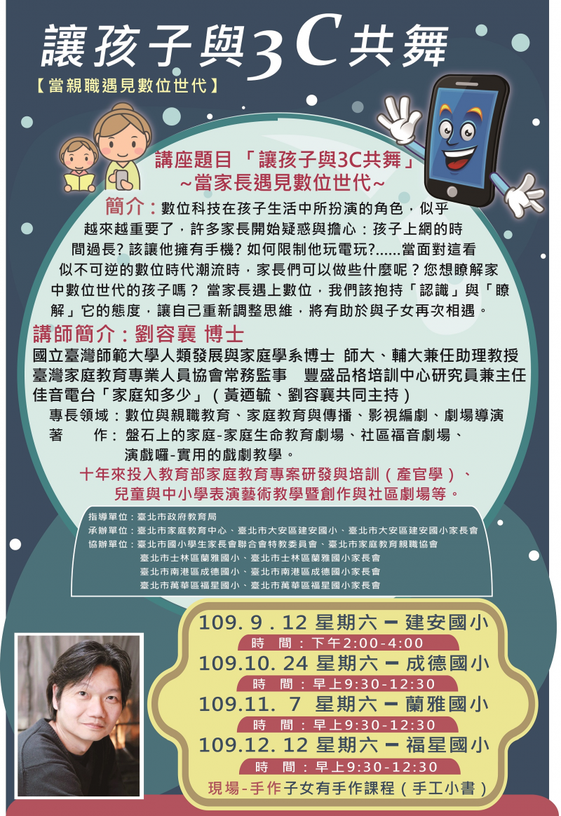 家長職能提升一直是各校家長會努力的目標之一,家長的成長讓陪伴孩子更有品質,為此臺北市國小學生家長聯合會特教委員會於東南西北四區辦理4場「讓孩子與3C共舞」講座,邀請劉容襄博士主講,幫助家長遇到數位世代時,有聰明的對待方式。爸媽聽講座的同時,孩子可以參加精彩的手作課程,讓每月有一個豐富的周六親子學習日。講座第一場首先從南區開始,於開學第二周9月12日周六下午二時在建安國小舉辦,十月份訂於10月24日於東區南港成德國小、十一份月份訂於11月7日於北區士林蘭雅國小、最後一場訂於12月12日於西區萬華福星國小。本身也有特殊兒的陸芊榕總召鼓勵家長走出壓力,吸收新觀念,並且結交正向、學習的家長夥伴,幫助自己就能幫助孩子,還有相同需要的家庭。