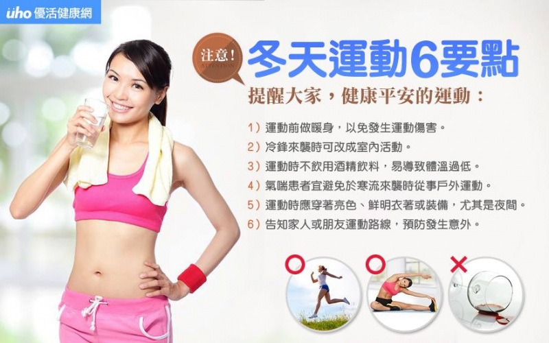 (優活健康網記者談雍雍/綜合報導)冬天氣溫偏低,但為了維持身體健康,仍要保持動態生活。而運動前除了暖身運動要做足外,運動路線、天候狀況、身體體溫等都需特別留意,才能安全運動、強身健體!