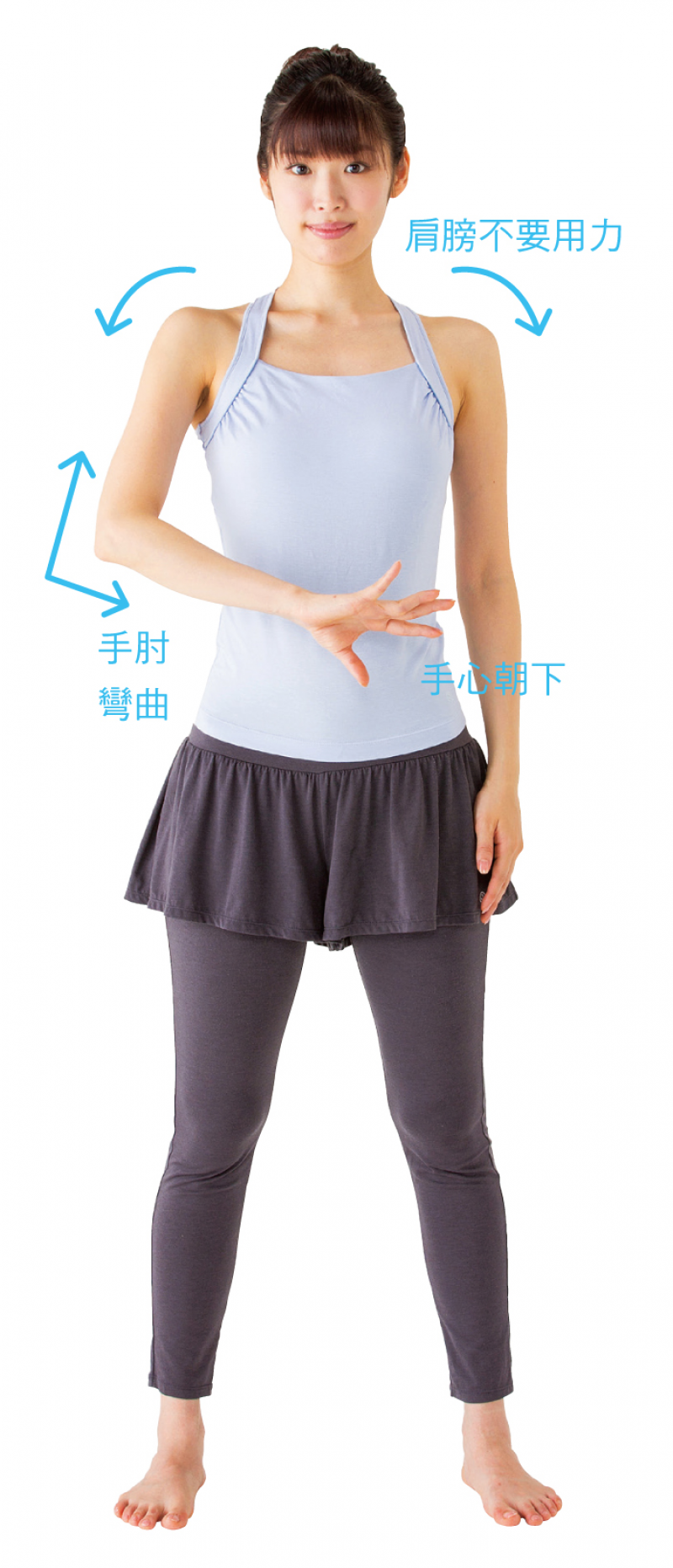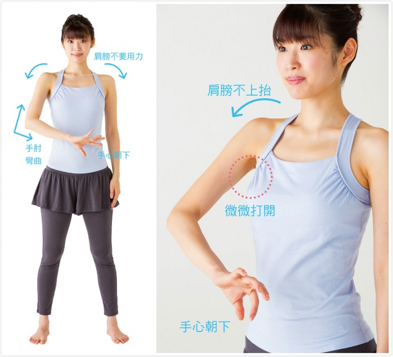 1. 站立,肩膀放鬆。將右手手心朝下放置於腰前,彎曲手肘。