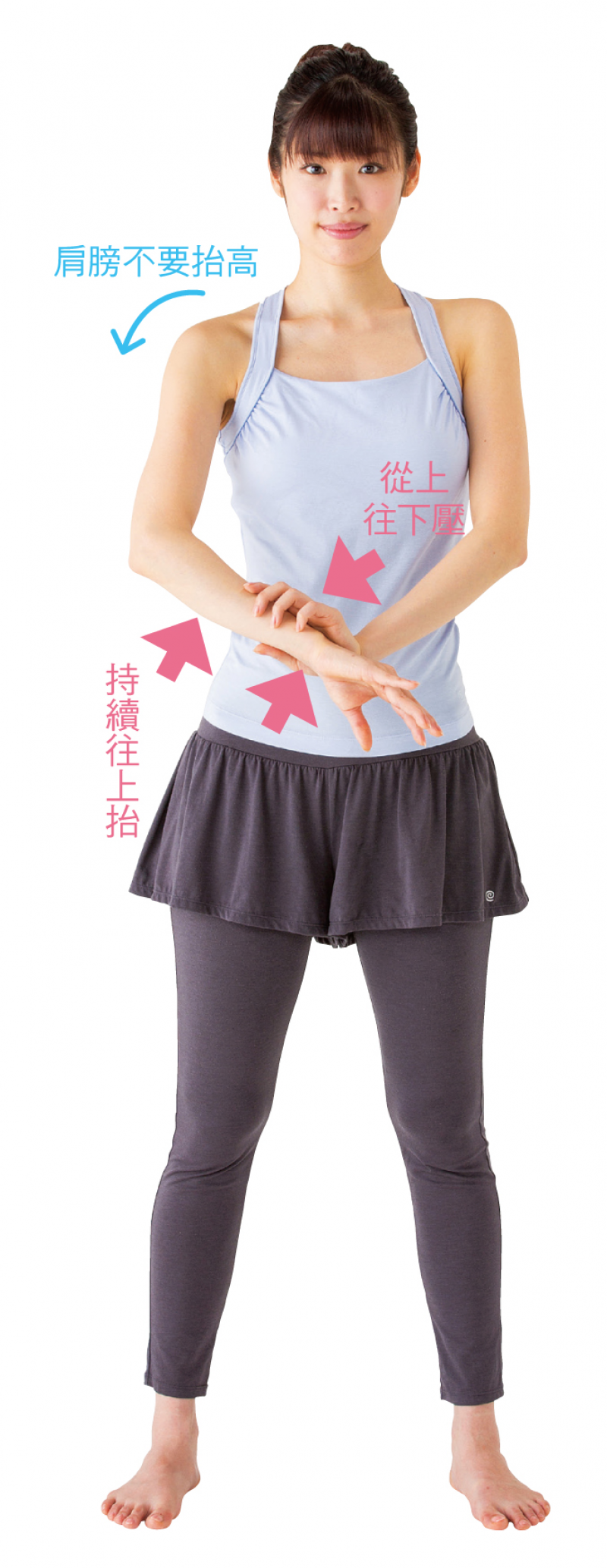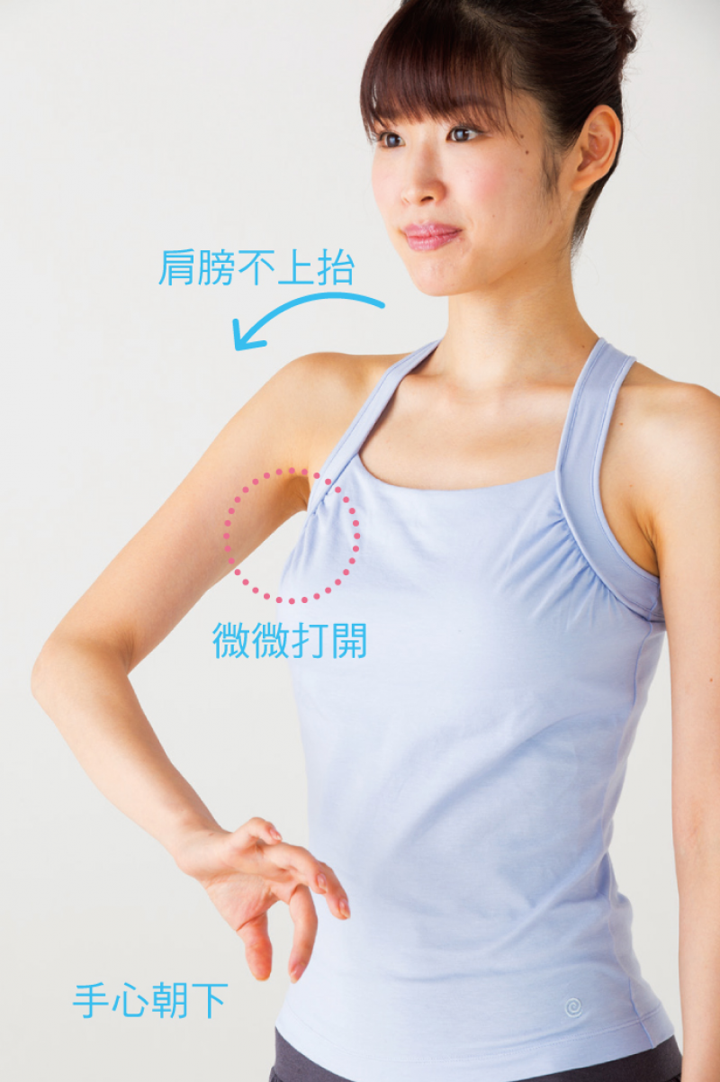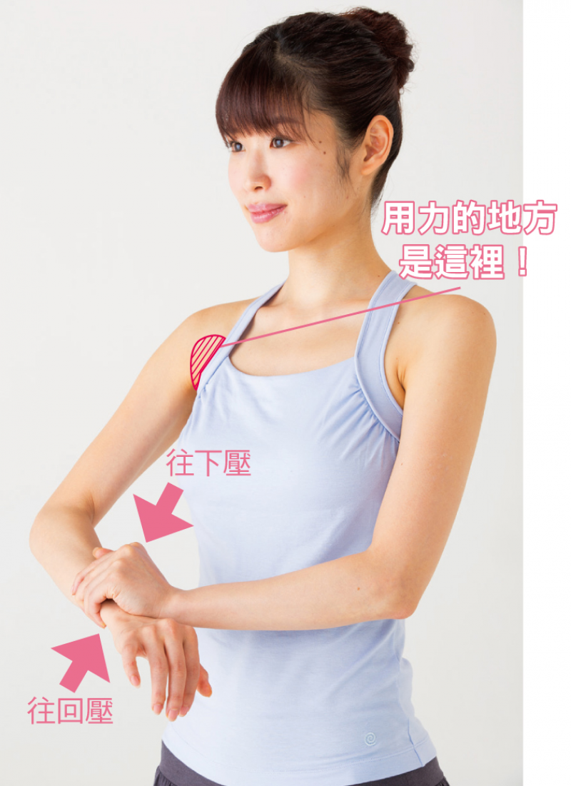 把力量集中在肩膀深層。須留意手肘的角度與手心方向。