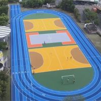 從天空俯瞰亮藍色的跑道,搭配黃色、橘色的暖色球場,中間還留有一些墨綠、淺灰,讓色調更和諧,五彩繽紛的操場,就像都市叢林裡調色盤,抓住所有人的目光。