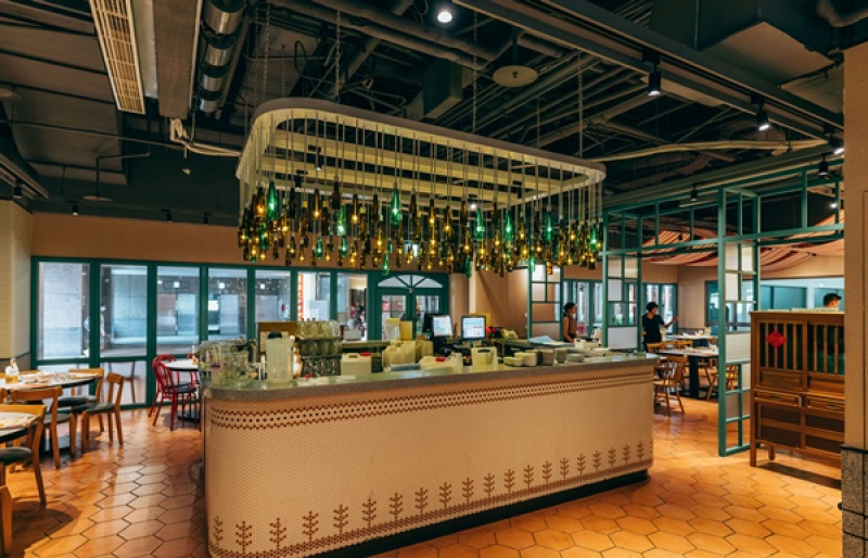 並將濃濃的懷舊台式風情融入至用餐空間,以復古元素妝點,配色卻很新穎清新可愛,經典窗花搭配綠色木作窗框、橘色六角磁磚、磨石子餐桌、吧檯酒燈、辦桌牆等設計帶有文青風美感,因此也成了網美、網紅的最愛,整體洋溢家的溫馨自在,也充滿了辦桌的歡樂氛圍。