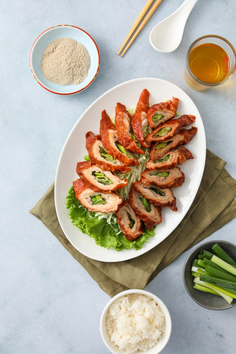 台灣經典菜「脆皮肥腸」,先將肥腸燉滷1.5小時,淋上脆皮醬汁後風乾,鑲入整株香蔥油炸,搭配香蔥胡椒鹽,非常適合下酒。
