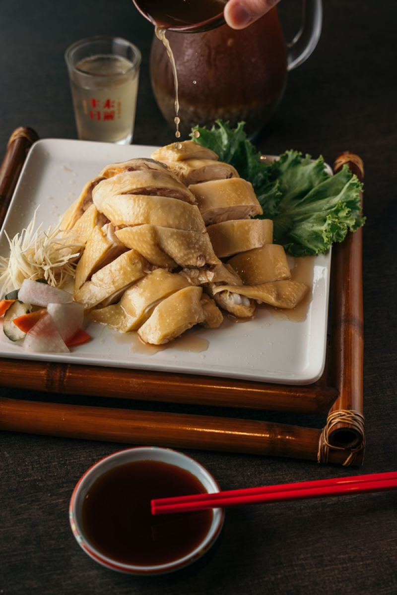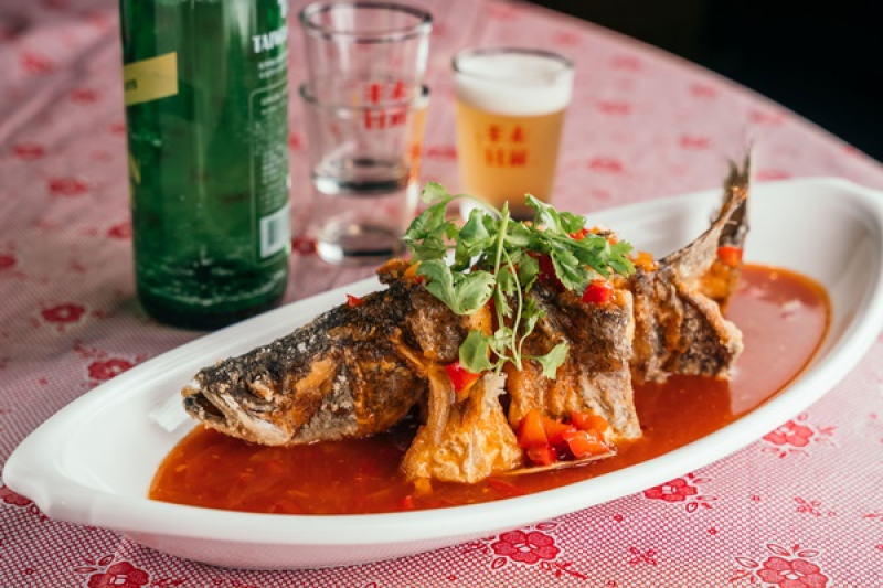 海鮮料理「糖醋鱸魚」,酥炸好整條魚淋上獨門水果風味的糖醋醬,外皮香酥、魚肉鮮嫩,酸甜好滋味。源自北投60年代道地酒家菜,湯品「魷魚螺肉蒜」,融合乾魷魚、罐頭螺肉、排骨及蒜苗的甘甜與鮮味,湯頭濃郁不膩口,湯頭有三味,一滾清二滾鮮三滾甜。加上主食「寶島米糕」及白飯,再來盤民間市場小點「菜燕」,以冬瓜糖、洋菜條熬煮後放涼成凍,讓人勾起小時候的回憶。