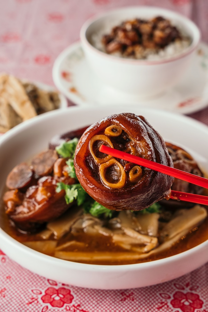 「古早味滷豬腳」特選豬後腳,高溫油炸至皮酥脆,以秘製湯汁滷製多時,香噴噴的豬腳口感Q彈軟嫩不油膩,不由得想起阿嬤的味道。