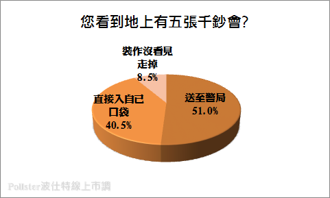 假如今天你在地上看到的不是一百塊,五百塊這種相對來說較小的金額,是整整五張千元大鈔就在你面前的地板上,你的反應會是哪種呢?調查顯示,大家的反應很兩極。有51%的人,看到地上有五千元大鈔,毫不遲疑的發揮公德心,會直接送到警察局。畢竟掉錢的人一定也是心急如焚,絕對是焦急的尋找錢到底掉到哪去了。這樣的人高達半數,可見台灣的公民教育還算成功,不會把自己的快樂建立在別人的痛苦上。但也有40.5%的人,認為五千元不算是甚麼太大的數目,會在別人沒看見的時候,偷偷的放到自己的口袋裡,算是一筆意外之財。不過找錢的人可就欲哭無淚了。剩下8.5%的人,選擇假裝沒看見的走過,也是一種不想找麻煩的心態,也許是一疊假鈔擺在地上,是某個整人節目的噱頭罷了。雖說這樣的人可能比較對社會冷漠,不過也算是一個自保的方法。