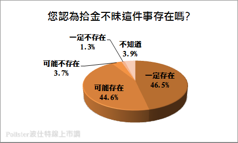 高達九成的人,對於拾金不昧這件義行存不存在的看法,都表示肯定。46.5%的人可能受過別人的幫助,所以非常肯定的認為,拾金不昧是確實存在的事。44.6%的人,可能沒有相關的經驗,但是經過新聞的播報,或是基於對人性本善的相信,也認為拾金不昧是可能存在的事。當然也要呼籲大家,撿到錢最好是交到警局比較好,因為這樣不僅做了一件善事,當你看到別人失而復得的感激表情,一定也會因為自己做了一件對的事情而感到開心的!