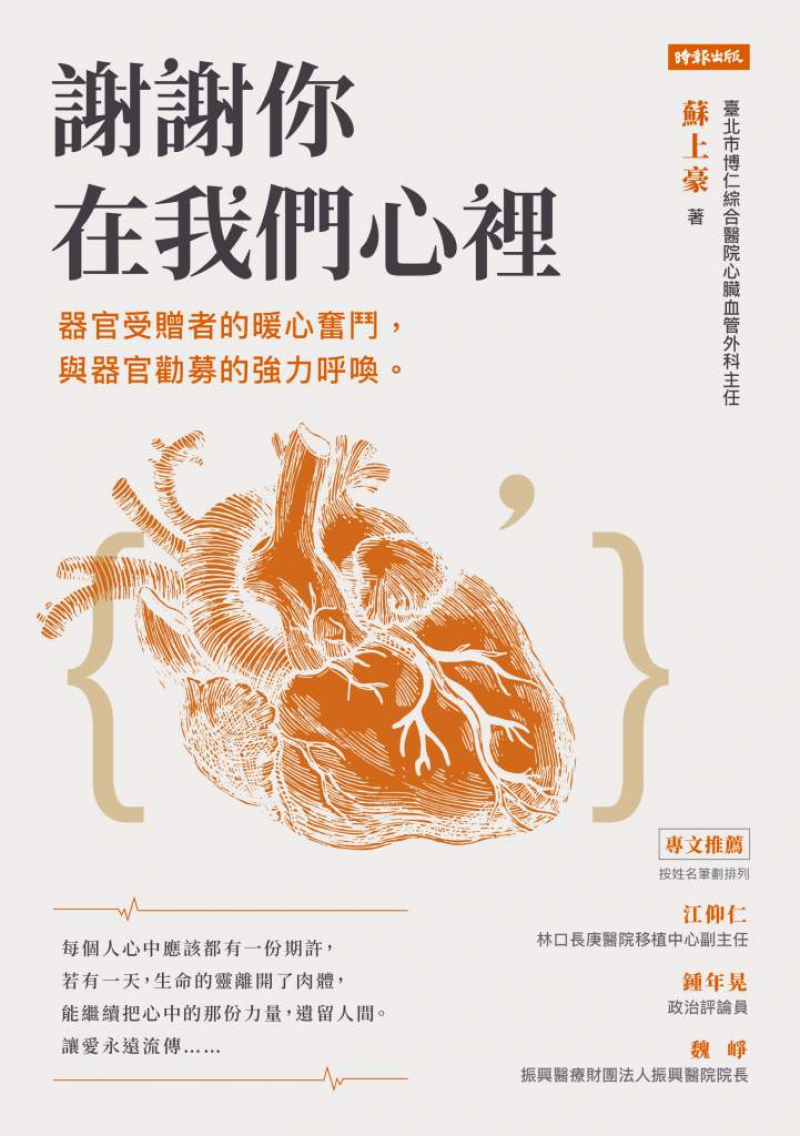 臺北市博仁綜合醫院心臟血管外科主任蘇上豪出版《謝謝你在我們心裡》(時報出版)提到,我想分享我照顧過並接受「心臟移植」的病人,希望透過他的故事,讓民眾可以多注意身體的警訊,更加留意自身的健康狀況。