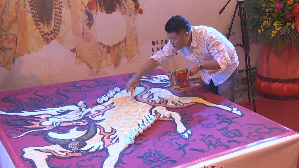 拿著米桶,一邊鋪灑白米,運用超過5種顏色以上的榖豆類,巧妙運用豆子的顏色,再搭配絢麗的燈光,為廟宇慶典帶來一個耳目一新的宗教藝術視覺饗宴。