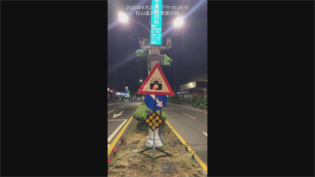 小小黑色一箱,接上接頭測試訊號,員警架設臨時測速照相機,就在150公尺遠的地方,另一名員警拿告示牌,按照規定,在測速照相機前必須有提醒告示,但就有民眾投訴,在台北市松山區,擺設的警告牌不清楚,害他吃上罰單。