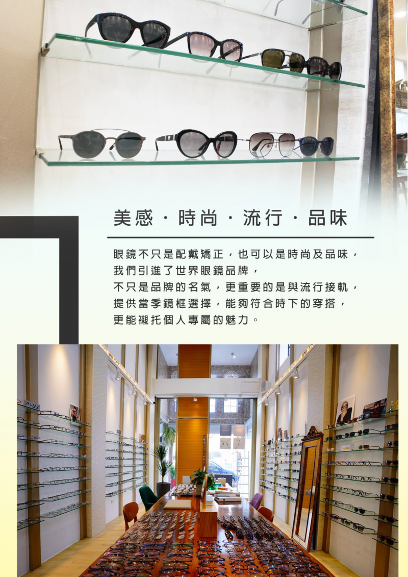 眼鏡不只是配戴矯正,也可以是時尚及品味,我們引進了世界眼鏡品牌,不只是品牌的名氣,更重要的是與流行接軌,提供當季鏡框選擇,能夠符合時下的穿搭,更能襯托個人專屬的魅力。