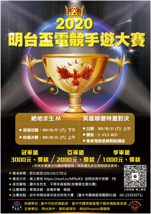 資處科同學為主力的明台鳳凰電競校隊,參賽經驗豐富曾入圍全國高中職LSC聯賽,榮獲TIESA傳說對決春季巡迴盃台中區亞軍、高雄盃全國校園電競大賽亞軍、修平盃傳說對決電競大賽亞軍等佳績,在國手級教練與電競策略專業師資帶領下各個鬥志高昂。