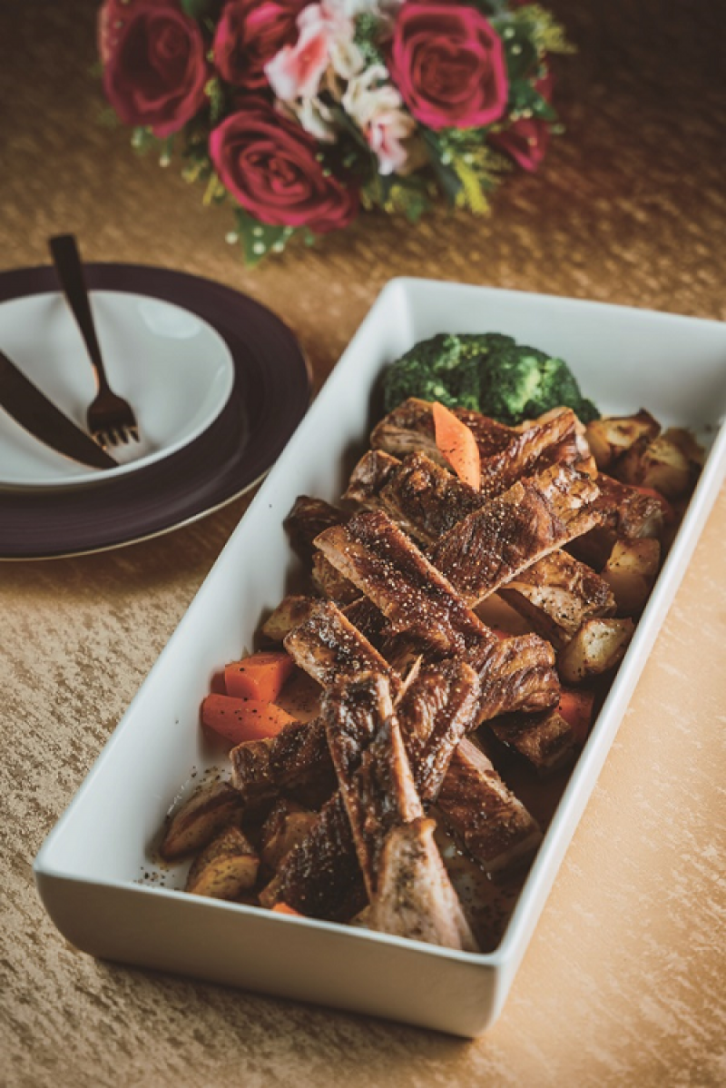 色香味俱全的「鮮蔬黑椒豬肋排」,將豬肋加入醃料醃漬入味,先蒸煮把筋肉變得軟嫩後送入烤箱烤,再撒上黑胡椒,搭配烤時蔬馬鈴薯、胡蘿蔔、花椰菜去油解膩,這油脂豐富的黑椒豬肋排香、鮮、嫩,保證大快朵頤,忍不住一塊接著一塊吃。